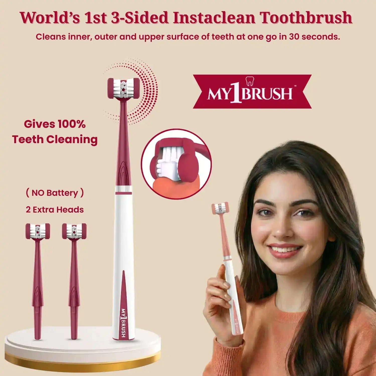 My1Brush - 3 Sided Toothbrush | Ultra soft bristles | 1 Year pack with 2 replaceable heads