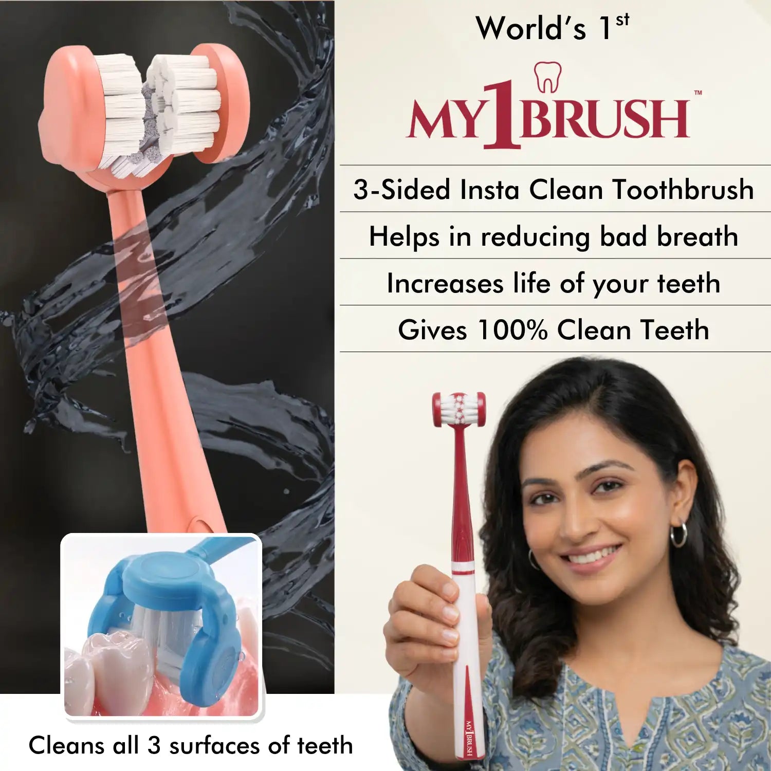 My1Brush - 3 Sided Insta-Clean Manual Toothbrush | Soft Bristles | 1 Year pack with 2 replaceable heads