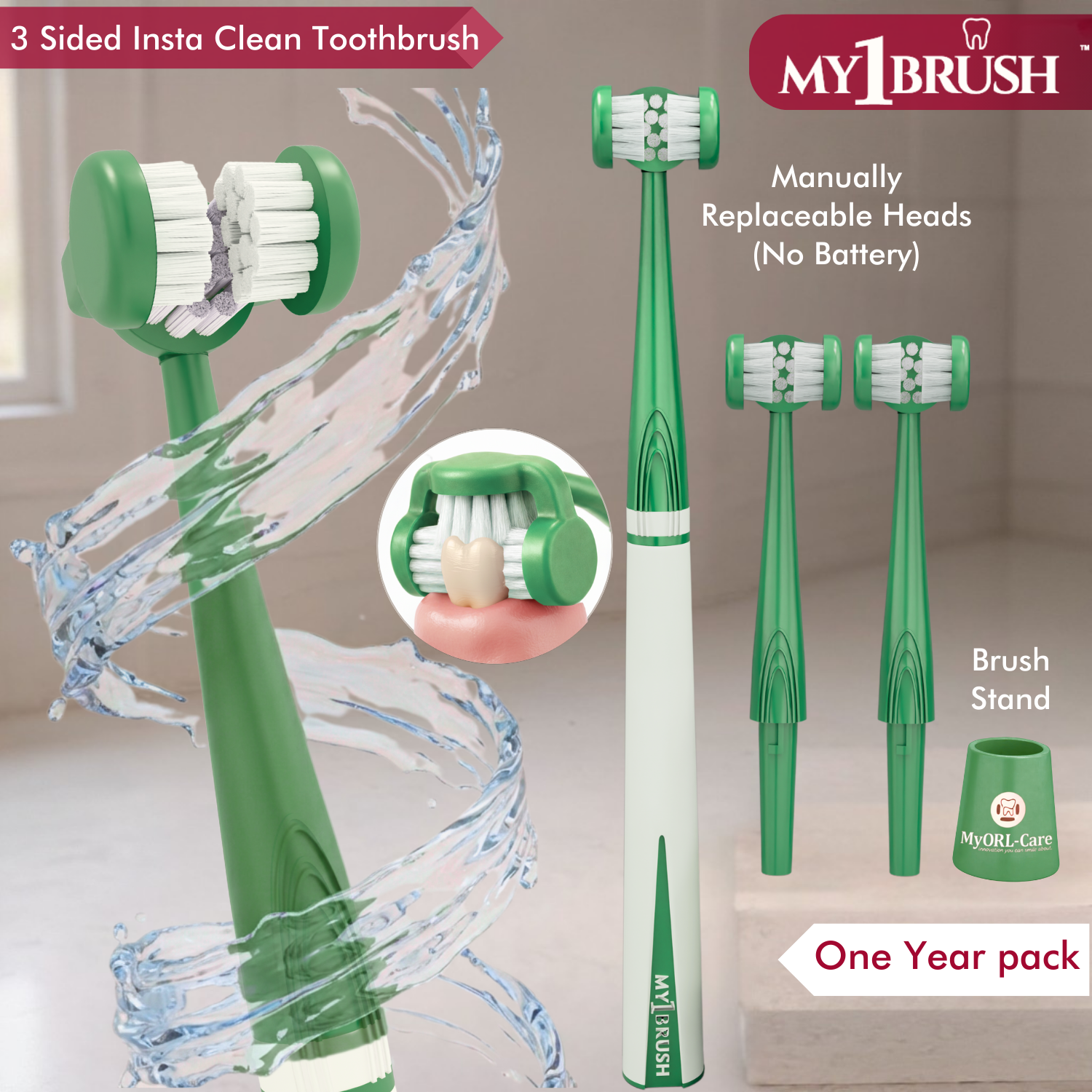 My1Brush is a next-generation manual toothbrush with a unique triple-surface design that cleans all sides of your teeth at once. With replaceable heads and no batteries required, it delivers a full year of smarter, more convenient oral care.